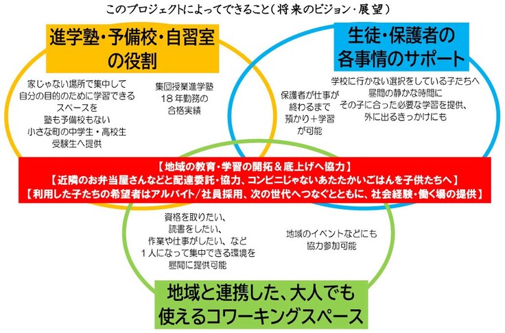 ■この地域には、家ではない場所で集中して勉強したいと思う子どもたちや生徒が行くところがありません。図書館は5時まで、予備校や学習センターはなく、大手塾もほとんどないからです。部活の後に勉強しに行きたいのに塾は閉まっていたり、学校が休みだから勉強しに行こうと思ったら休館日だったり、とたくさん困っている声を、勤めていたとき、遠くから通ってくれていた中学生・高校生からお聞きしています。保護者や生徒から数十人の要望を受けて、数年かけて計画してきました。勉強したい・大学進学/勉強とスポーツ(習い事)の両立/私立中学受験をがんばりたい、都会の学校に進学したい、という小学生・中学生・高校生が、近隣の町をふくめ、とてもたくさんいらっしゃいます。自分は大学受験のとき、大手予備校の自習室に毎日、朝一番に行って最後に帰っていました。