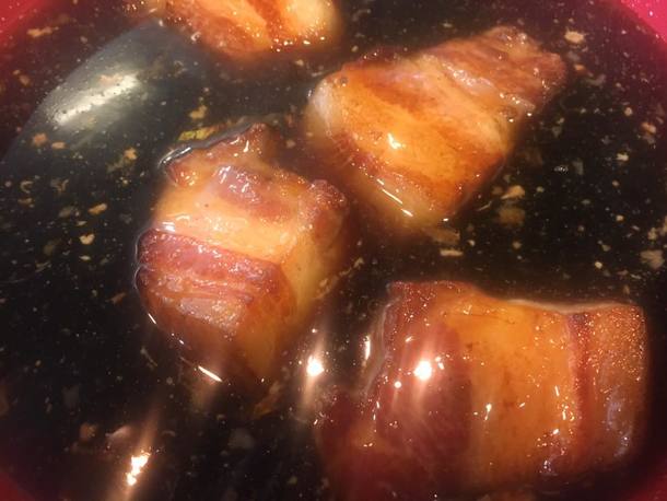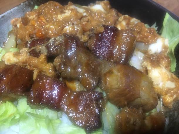 新鮮富豚を鉄板で焼き、万能源で甘辛く煮込んだ “角”煮丼