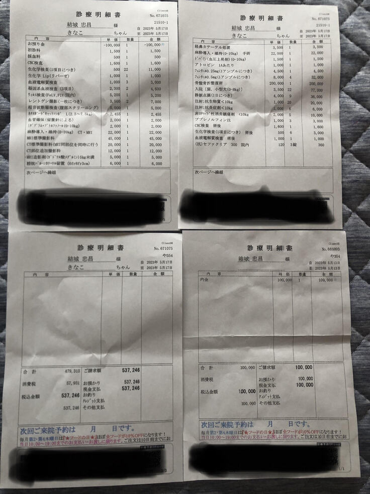 退院までの医療費は、前払いの¥100,000と¥537,246を合わせて¥637,246となりました。