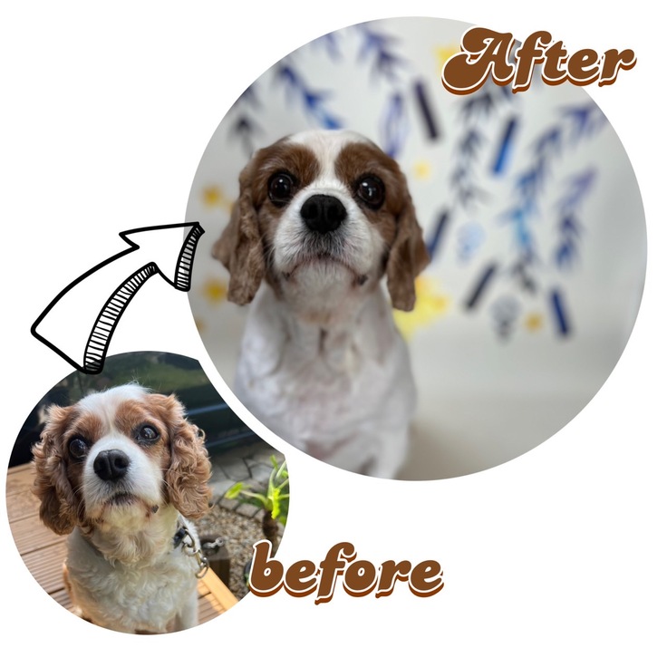 犬はもともと暑さに弱いかもしれませんが、心臓病になり、心臓に負担をかけない為にもフサフサの毛をカットしました✂︎キャバリア本来のクリクリの毛やフサフサの尻尾はないけれど、手術にむけて体調管理は大切です✨