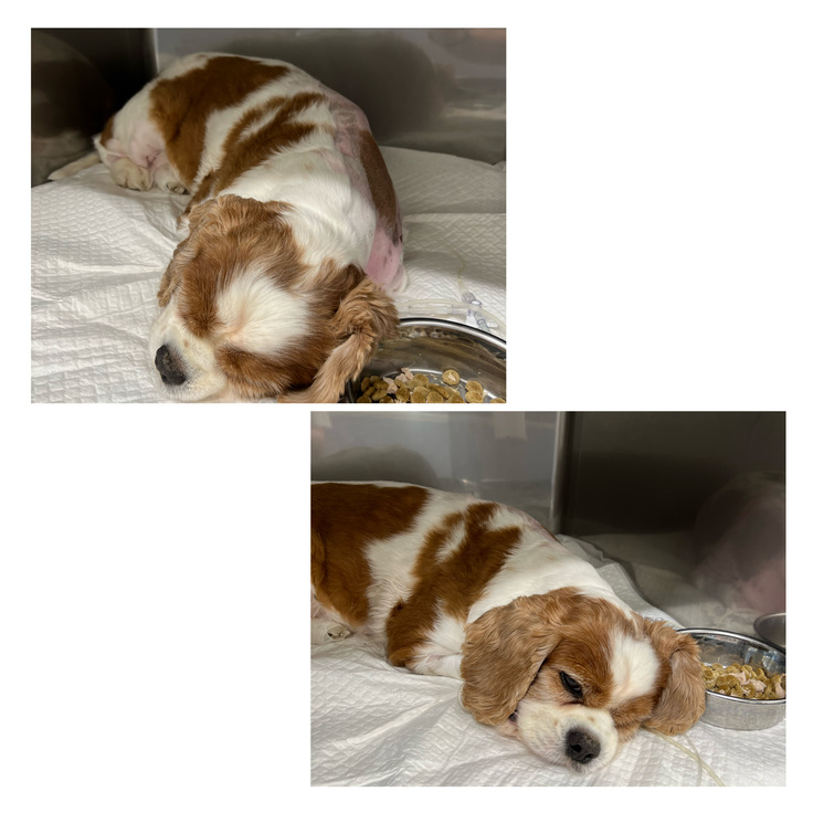本人は鎮静剤で寝てましたが、状態が落ち着き、ICUから一般犬舎に移っていました。ご飯は食べなかったようですが、頭を撫でながら、話しかけたら、薄目を開けて見てくれました👀