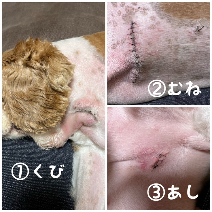 手術で縫った箇所は①くび②むね③あしのつけ根でした。痛々しい感じですが、あんまり舐めたりすることもなく、いつもと変わらずに過ごします🐶