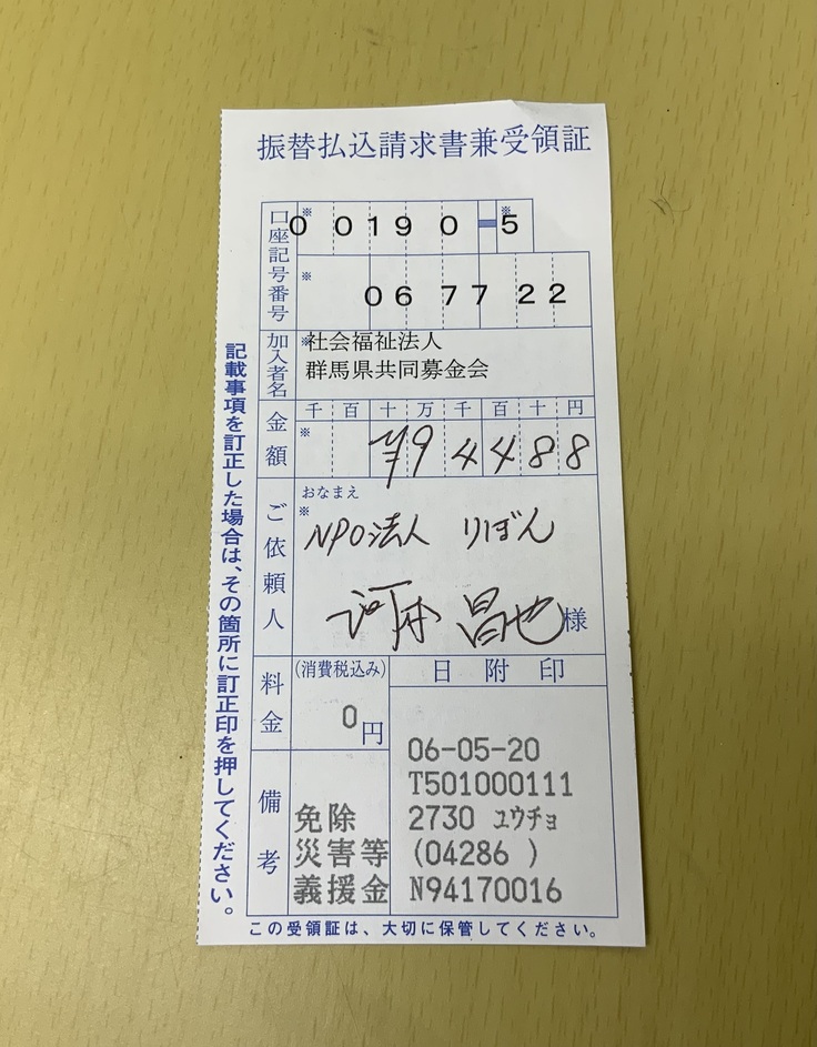 子ども達の応援へとお金を実際に活かすために「赤い羽根共同募金」へと全額寄付をさせていただきました。