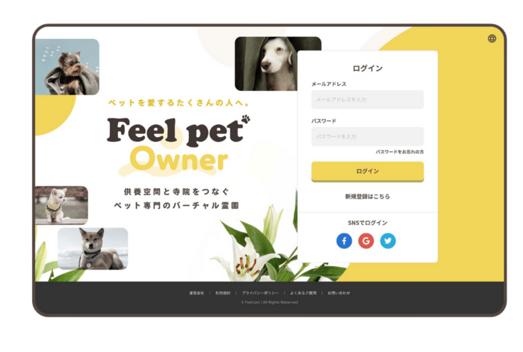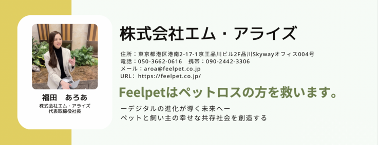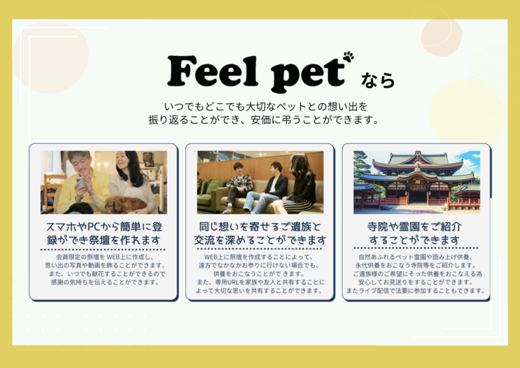 また、Feelpetの供養空間を利用することでペットの死後、少しでもペットロスが癒え、次のペットを飼う事に抵抗をなくし新しい家族を迎え入れる事にもつながる事を願っています。