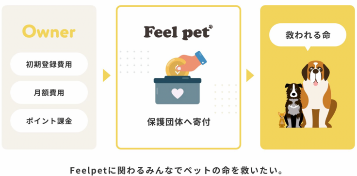 私たちは利益を追求するだけではなく、Feelpetでペットを大切にする文化を広めると共に、収益の一部を保護団体に寄付をし保護施設の充実や里親探しの支援、啓発活動に力を注いでいきます。