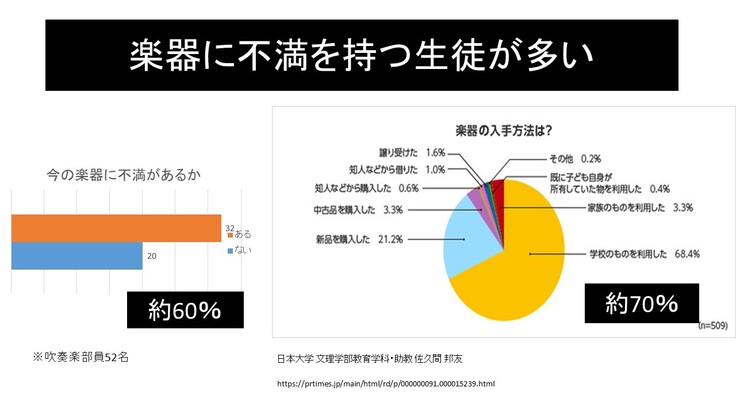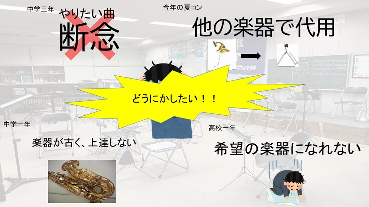 私がこのプロジェクトにチャレンジしたきっかけは私が吹奏楽部に所属していてある悩みを抱えていたからです。それが「楽器不足」です。この楽器不足が原因でやりたい楽器ができない、曲中に出てくる楽器を他の楽器で代用する、最悪な場合やりたい曲を断念したりもしました。私は、これでは若者が音楽に触れる機会を損失し日本の音楽文化が衰退してしまうと思いました。