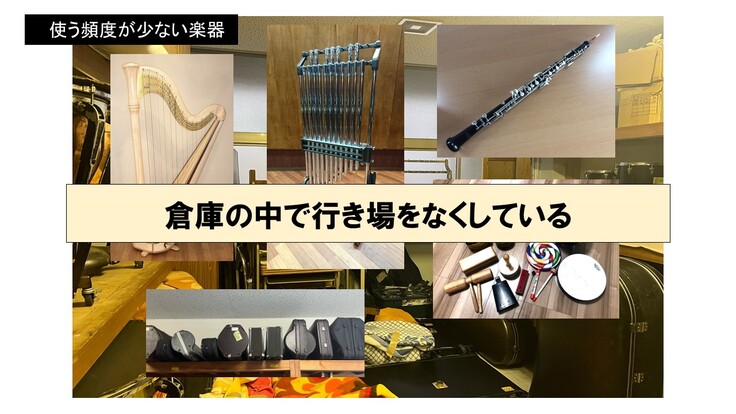 調査した結果、打楽器など種類がたくさんあるが使用頻度の少ない楽器や部員が年によって増減するためそれに伴い楽器不足や余らす原因になっていることに気が付きました。