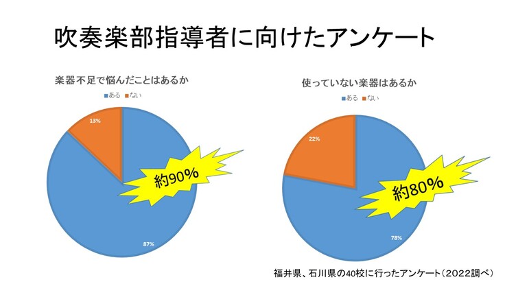 そこで私はまず、インタビューから始めました。具体的に楽器不足で悩んだことはあるか、楽器不足で困ったらどうしていたか、余っている楽器はあるかという問いを県内外の30校の学校に問いかけました。その結果、約九割の学校が楽器不足で困っていると回答し、約八割の学校が余っていて使っていない楽器があると回答しました。