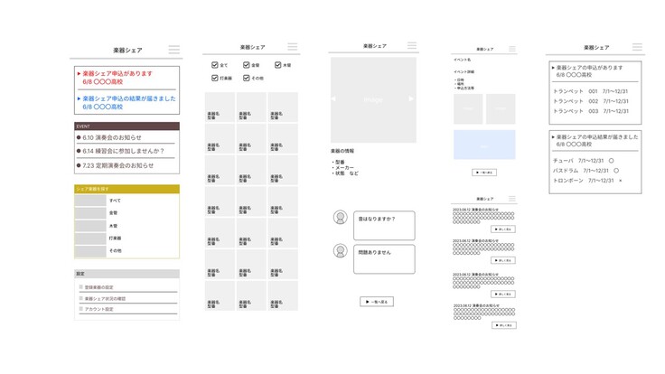 現在アプリのベータ版は完成して試験的に運用していますが正確な規約やシステム関係の補充が間に合っていないのでこの支援金で補っていきたいと考えています。この「Brasus」というアプリの主な機能は二つあります。まず一つ目が楽器を楽団間でシェアするシステムです。上の写真ように使われなくなった楽器を貸してほしい楽団に貸す、また貸してほしい楽器をアプリ内から探したり呼びかけをして貸し出し可能な楽団を探せる機能です。