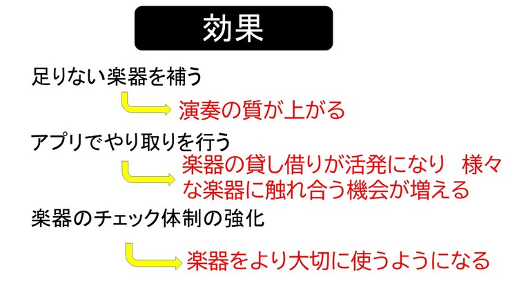 この楽器シェアシステムが実現すると、学校ごとの楽器所有格差を埋めることができる