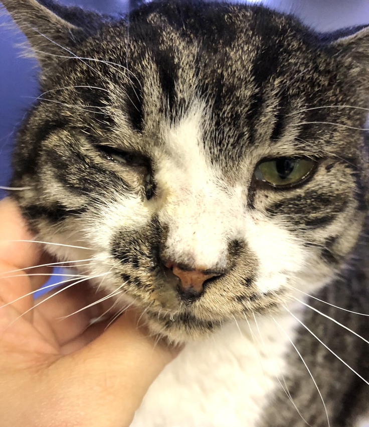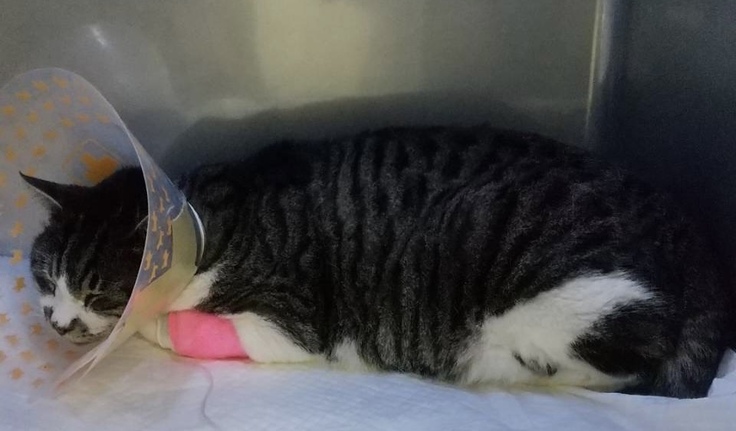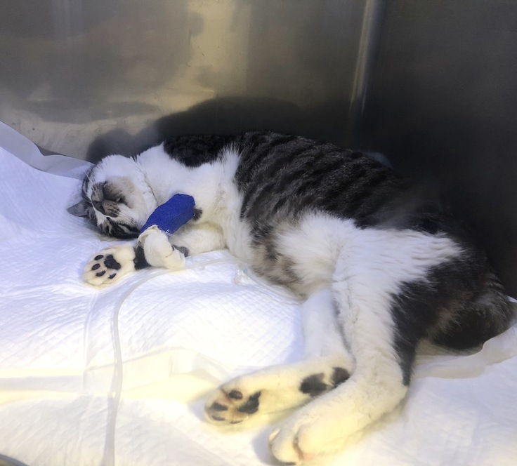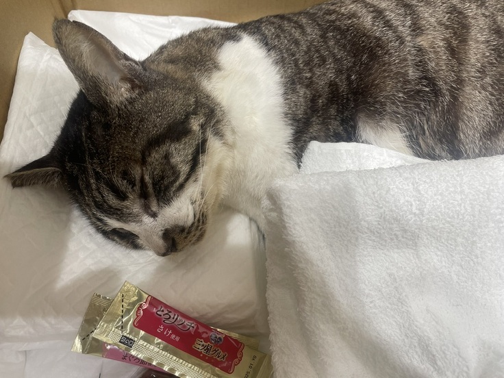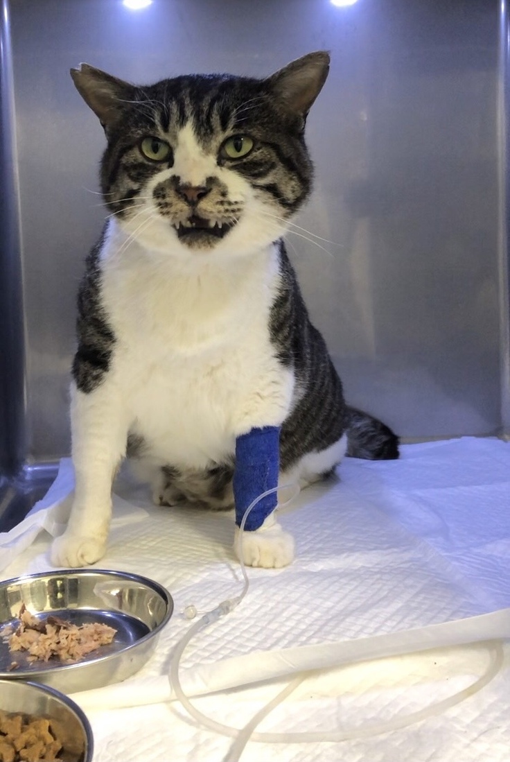 とらちゃんの元に駆けつけると、現場に居合わせた方からなんと「とらちゃんの里親を検討したい」とのお申し出が!仕事で訪れている方で、以前からとらちゃんを見かけていて気になっていたとのこと。こんな奇跡のような出会いと同時に、とらちゃんは地元の動物病院にて闘病生活に入ったのでした。