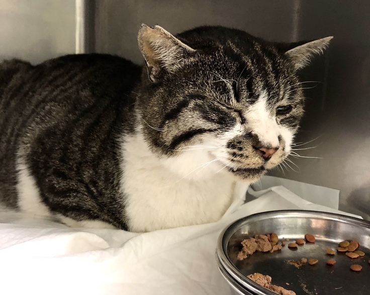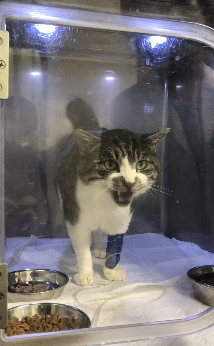 「とらちゃん、ついに酸素室から普通の入院室に移動!体調は朝より元気になっているとのこと。結膜炎の右目は閉じたまま」