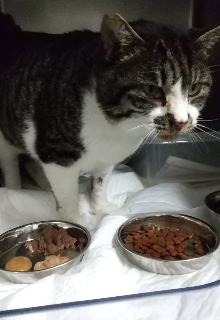 「とらちゃんの夜ご飯時に面会。副院長先生にもすごく慣れていた。ドライフードは『三ツ星グルメ』が好きとのこと。『ロイヤルカナン消化器サポート可溶性繊維』も与えているそう。」