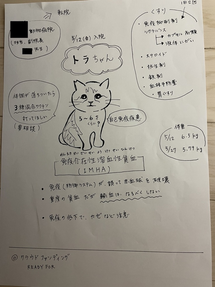 「採血の時、抵抗するようになった。給餌の時にシャーシャー言っている。昨日の晩ご飯は完食。ウンチはまだ出ていない。炎症を抑えるためステロイドを投与、免疫抑制剤の服用も始まっている。エコー検査結果は、出血無し、腹水・胸水無し、肝臓・脾臓がちょっと大きくなっているとのこと(免疫の病気は腫れやすい)。心臓も問題無し。IMHAの可能性がある場合、半年くらい『シクラバンス』という薬を投与する必要がある。費用は同院の野良猫割引を利用しても1カ月8,000円ほど」