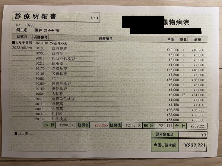5月28日(日)までの治療費が232,221円。6月4日にとらちゃんは退院し、6月4日までの残りの入院治療費が64,627円でした。愛情あふれるU様家族に迎えてもらえることになり、現在トライアルに出発しています。お迎え後、引き続き必要な治療をしていただけることをお約束しています。U様には、今回譲渡するとらちゃんの受け入れの同意、クラウドファンディングのストーリーに公表されることに関しての同意を頂いています。