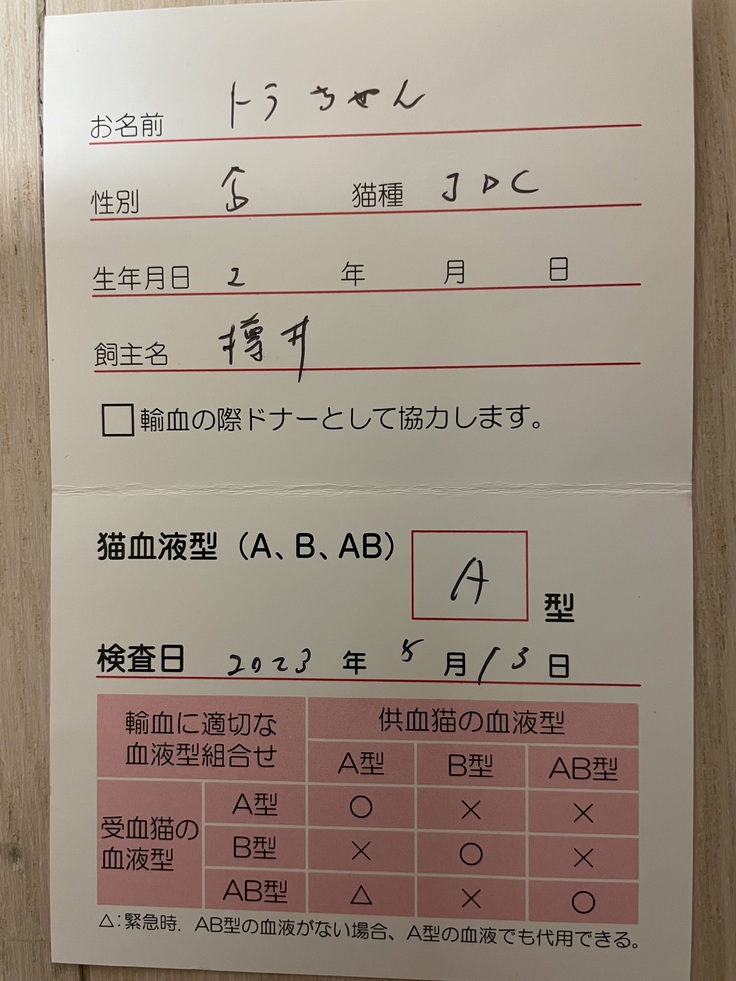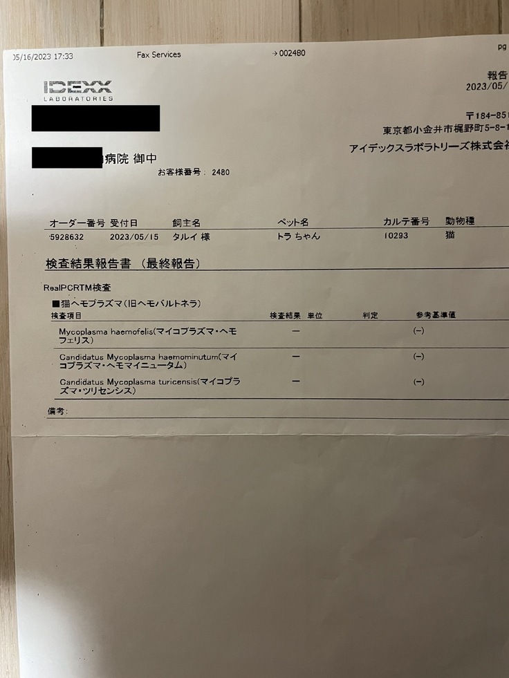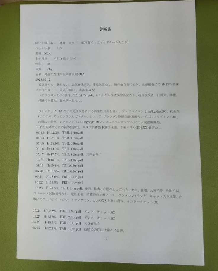 「結論から言うと重症で、この2週間が山場。 貧血、黄疸の数値が悪く、ヘモプラズマ感染症と思われるが、免疫介在性溶血性貧血(IMHA)や伝染性猫腹膜炎(FIP)の可能性もあり、後者2つだと非常に深刻。明日エコー検査や内臓系の出血などを調べ、輸血と免疫抑制の薬を使う判断をする。猫エイズ・猫白血病はどちらも陰性」