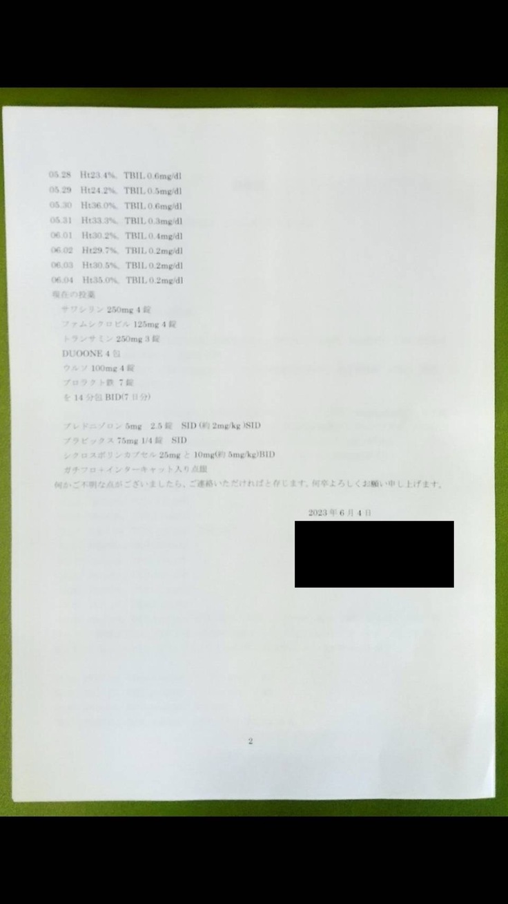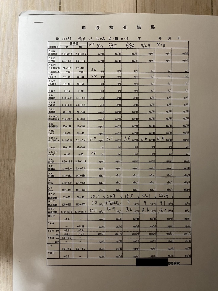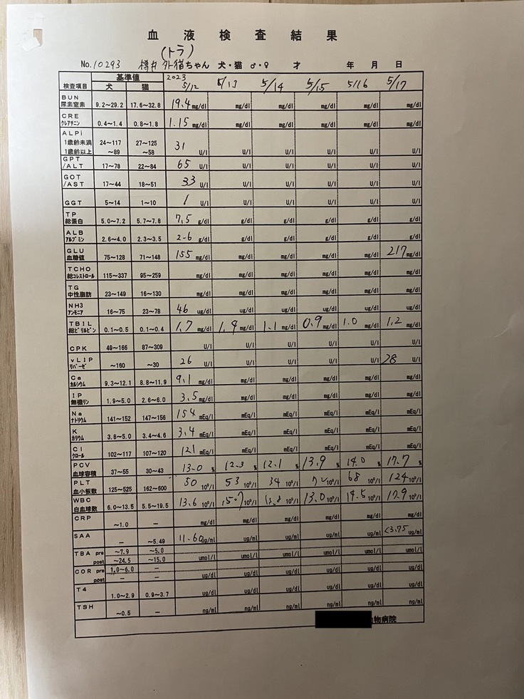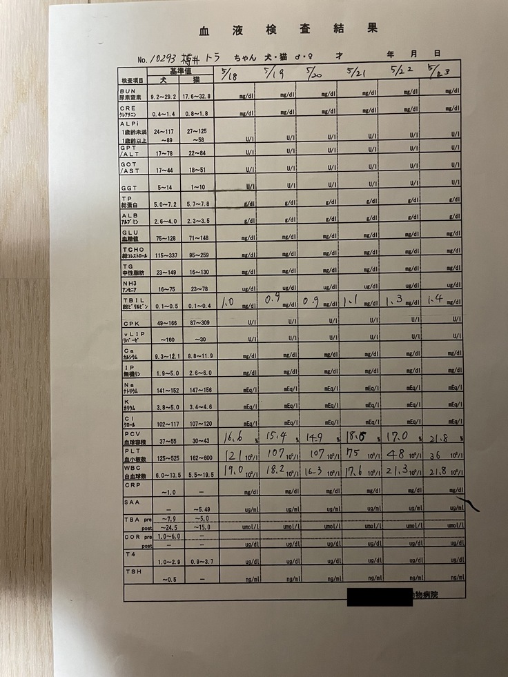 「血球: 28.2 かなり上昇。黄疸: 1.5と少し高い。食欲: あり。風邪を引いたようで結膜炎を起こしているので点眼を開始。ステロイドを使っているため肝臓が少し腫れているが、数値上では肝臓、胆嚢、膵臓に問題はない。黄疸値が少し高いが、これは血球が壊されているからで、通常は血球が上がると下がるため経過観察中。血球が上がっているので今週末か来週を目処に退院を考えている」