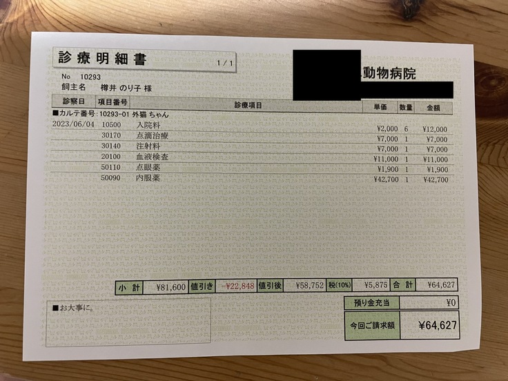 「今、すい臓の炎症を抑える注射をしている。すい臓の数値は正常だが、少し腫れているので胆汁の流れが悪くなっている。黄疸が改善すれば退院できる。血球は入院時の13.0と比べると17.4とだいぶ改善。食欲はむらがある。今日現在までの治療費概算は128,590円。ちょうど朝ご飯の時間に遭遇したが、食べっぷりは悪くない様子。昨晩より元気そうで少し安心」