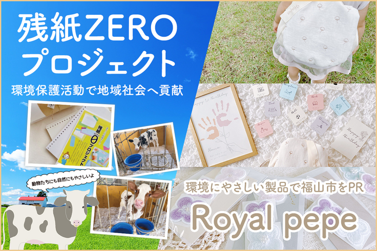 広島県福山市にある、創業から約50年続く印刷会社です。 製品化されない余白の部分の“残紙”を何とかできないかと思い、2021年に開発事業部を立ち上げて『残紙ZEROプロジェクト』という環境保護活動を始めました。 地元の保育園や牛小屋に紙を寄付するなど、地域貢献に力を入れながら、デザイン部門を立ち上げて、残紙を商品化する活動も始めました。 『Royal pepe (ロイヤル ぺぺ)』という福山市PRブランドも設立し、企画デザイン・商品開発・梱包などを全て自分たちで行い、日本全国の方々のもとへ環境にやさしい紙製品や、地元企業さまとコラボしたさまざまなオリジナル商品をお届けしています。 子育て中のママさんスタッフを中心に、毎月福山市内で手形足形アートのワークショップなどを行い、子どもたちやご家族の思い出を彩るお手伝いもしています。