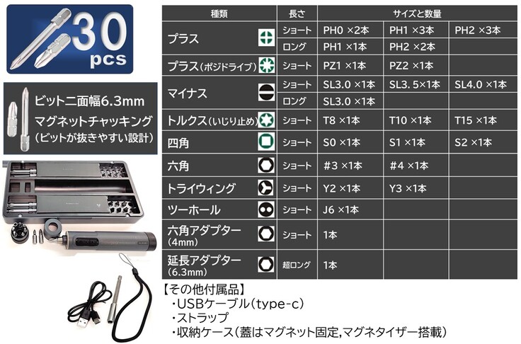 【付属品】本体、ケース、ビット10種30本、
