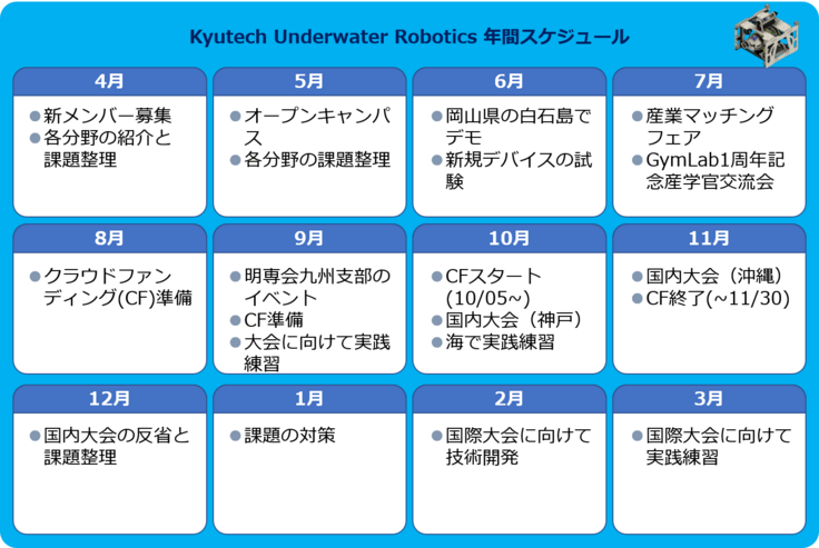 Kyutech Underwater Robotics は九州工業大学 若松キャンパスを拠点とする、水中ロボット技術者の育成を目的とした学生プロジェクトです