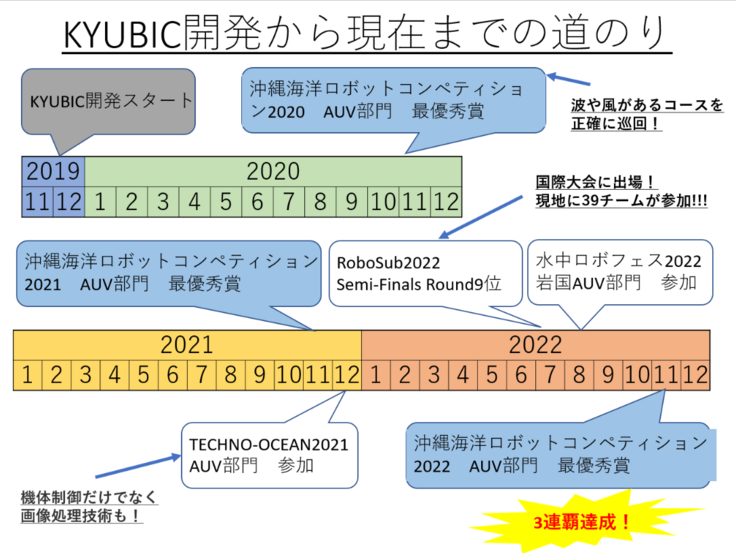 Kyutech Underwater Roboticsは設計から開発まで全工程を手掛け、水中ロボット「KYUBIC」を完成させました。私たちは沖縄海洋コンペティションで三連覇を成し遂げました。