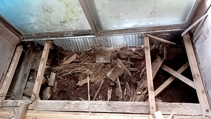部屋の中の荷物を運び出しサッシの歪んでる床を剥がしてみたところ白アリにやられていて 木はボロボロ😭地道に直していきます。