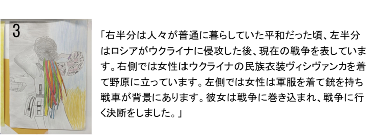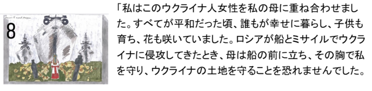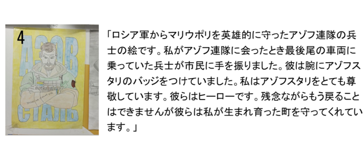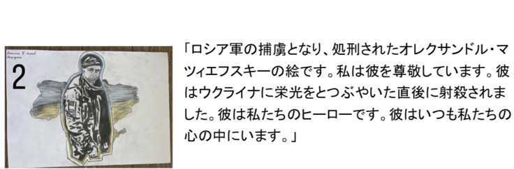 このアートセラピーのプログラムは、大量虐殺の直後のブチャで、タチヤーナさんが始めたプロジェクトです。アートセラピーとは、人に直接話さずとも感情を表現できる絵画療法で、様々な素材を使って新しい自己表現を見つける芸術療法です。ロシアによるウクライナへの大規模侵攻の初期2022年3月に、キーウの近郊ブチャで、ロシア軍による民間人の大量虐殺が起こりました。ウクライナ軍が奪還した後は、ブチャは、避難民のための仮設住宅が建設される町になりました。