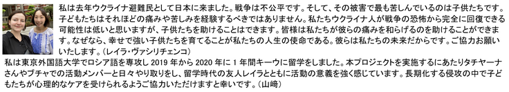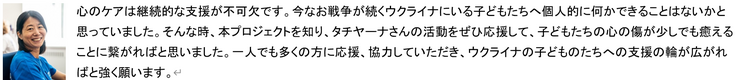 (*アートセラピー事業発起人であるタチヤーナ・マチュシェンコ様より、リターン提供の許可を取得しております。また、クラウドファンディングを行うこと、及び、寄贈を行うこと、名称記載の許可を得ております。)