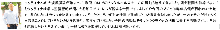 昨年3月にブチャでの虐殺が世界中で報道され、多くの寄付金がブチャに集まりました。しかし、支援は一時的なもので継続には至らないケースもあります。タチヤーナさんがはじめたリハビリテーションセンターもその一つです。一方で、戦争が子供たちの心に与える影響は甚大で長期にわたるケアが求められています。
