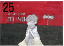 何歳の方かは分かりませんが、非常にデッサン力、構図の取り方が上手に思います。色合いもご本人の心の色を繁栄しているのでしょう、ウクライナ国旗と重ね、更に色が違うところから痛みがひしとひしと伝わってきます。絵自体はシンプルですが、語ることの多い内容となっており、才能のある方ではないかと思いましたし、日本的な表現(描きすぎず、シンプルに伝える)にマッチする気がします。