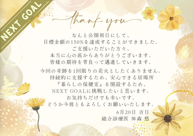 一般社団法人を設立し、 北海道内にて『暮らしの保健室』を開催する。資金使途:定款認証手数料 50,000円、登録免許税 60,000円、法人印鑑作成代金 10,000円、行政書士委託料 50,000円、ホームページ制作/委託費/維持費 100,000円、会場確保にかかる料金・雑費ほか 80,000円