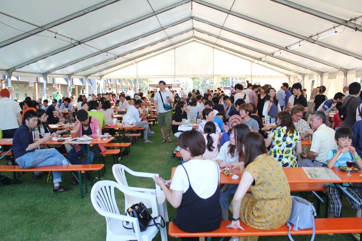 祭り会期中、オガール広場に設置される大型テント内で、ビアフェストを楽しむ人々