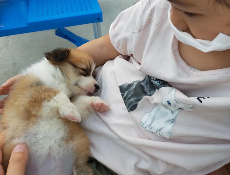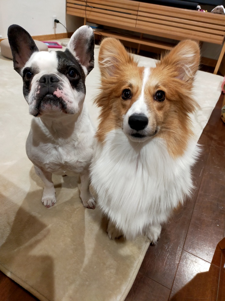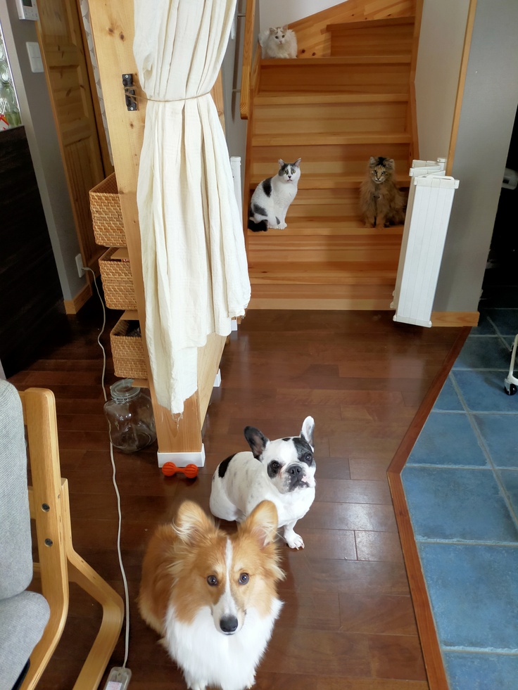 夫婦と中学生の息子と保育園の娘、フレブルのリン(6歳♀)、コーギーのメイ(10カ月♀)、元野良猫3匹♀♂♀と暮らしています。