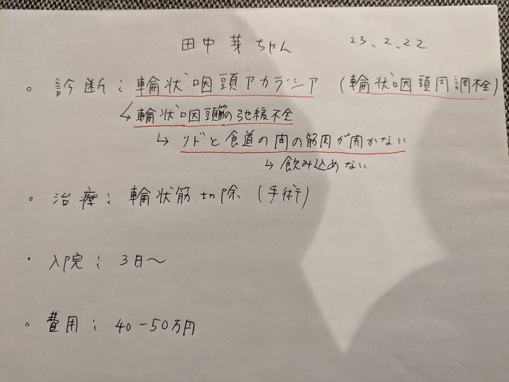 輪状咽頭アカラシアの手術前は肺炎治療をしてからとなるため費用の予測が困難です。