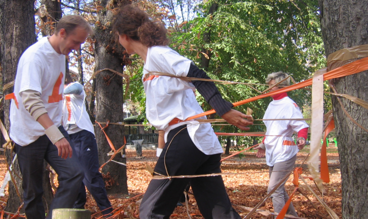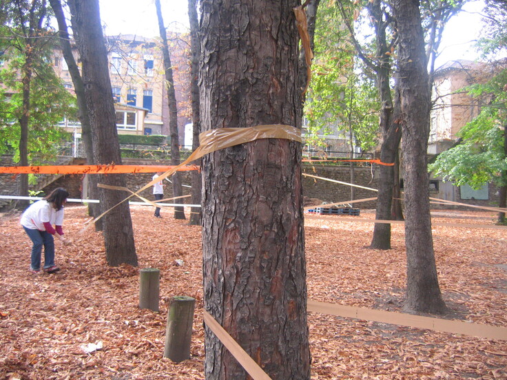 公園の木々にテープを張り巡らせることでそこを単なる病院空間から芸術空間へと転換させることが出来ました。更に皆が自由にテープを張り巡らすことでまるで蜘蛛の巣のような状態に陥りました。