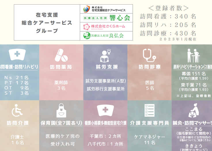 みなさまこんにちは。私たちは株式会社在宅支援総合ケアーサービスという会社です。母体となっているのは ご自宅への訪問による 診療/看護/介護/リハビリ/保育 以上を中心に千葉市内で多数の医療/介護/保育等の有資格者を抱える専門家集団です。
