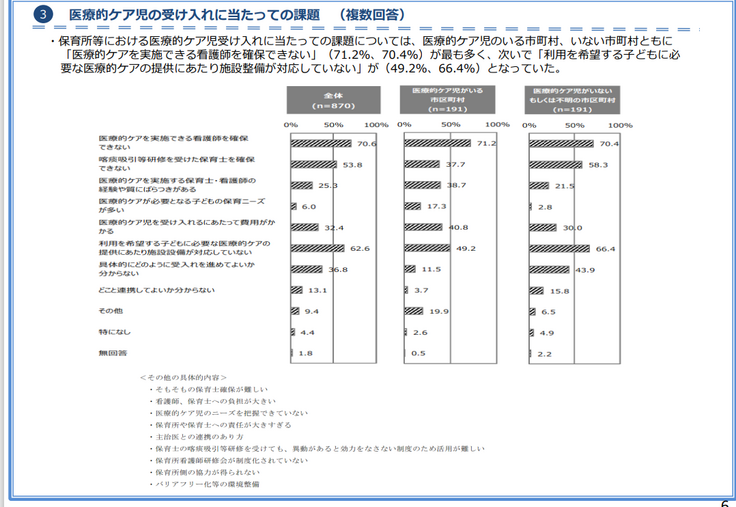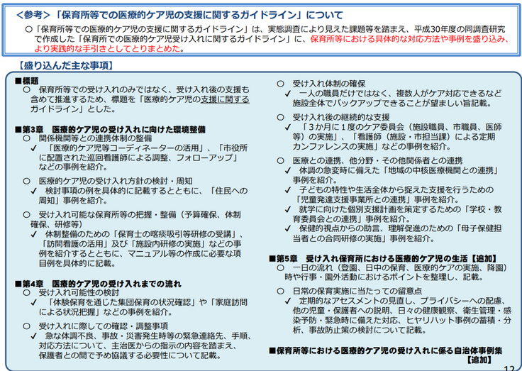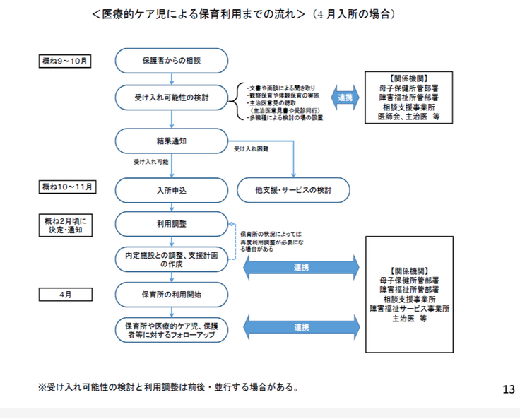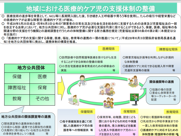 医療的ケアが必要な児童に対して、行政/民間の連携は当然として、医療/保育/福祉/教育機関が密に連携をする事が体制の整備をする上で必要である事も、厚生労働省の中でも議論がされている状況です。