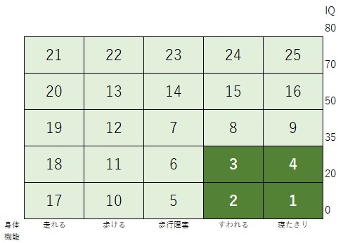 重症心身障害児とは、重度の知的障害と重度の肢体不自由が重複している障害児(者)をさし、下図大島分類の1.2.3.4にあたる方が対象となります。
