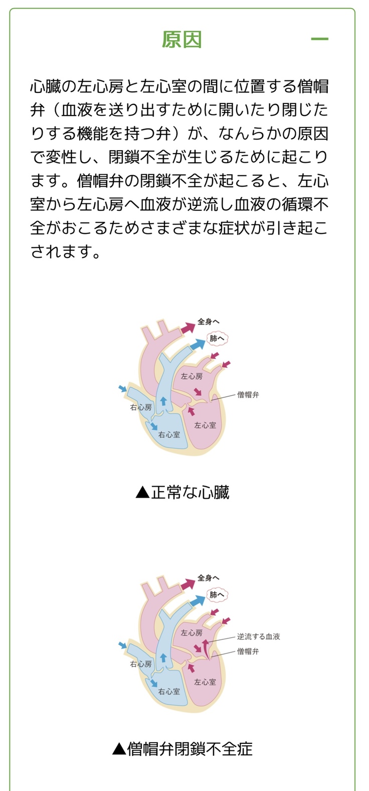 心臓の弁を閉じる腱が切れてしまったりした為、正常に弁が閉じず血液が逆流してしまう病気です。