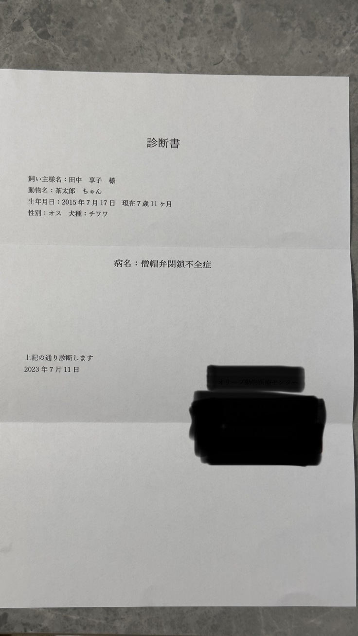 茶太郎の心臓病『僧帽弁閉鎖不全症』の手術費、入院費に全額充てさせていただきます。