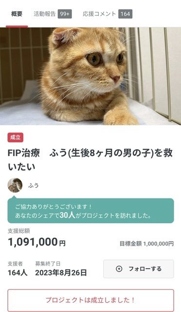 猫伝染性腹膜炎を患ったポンちゃんの明日をつないで頂けないでしょうか