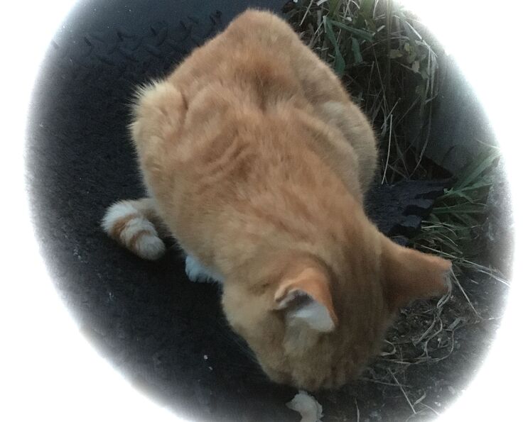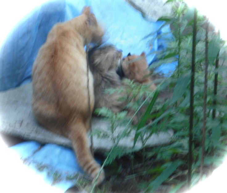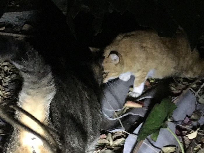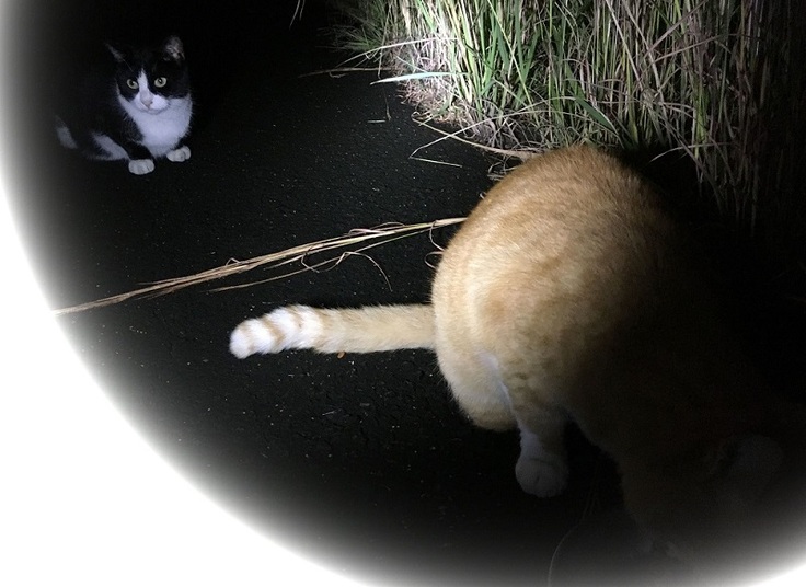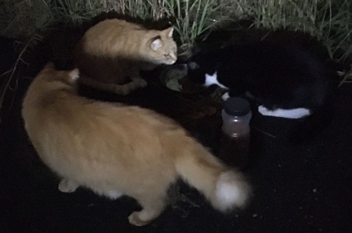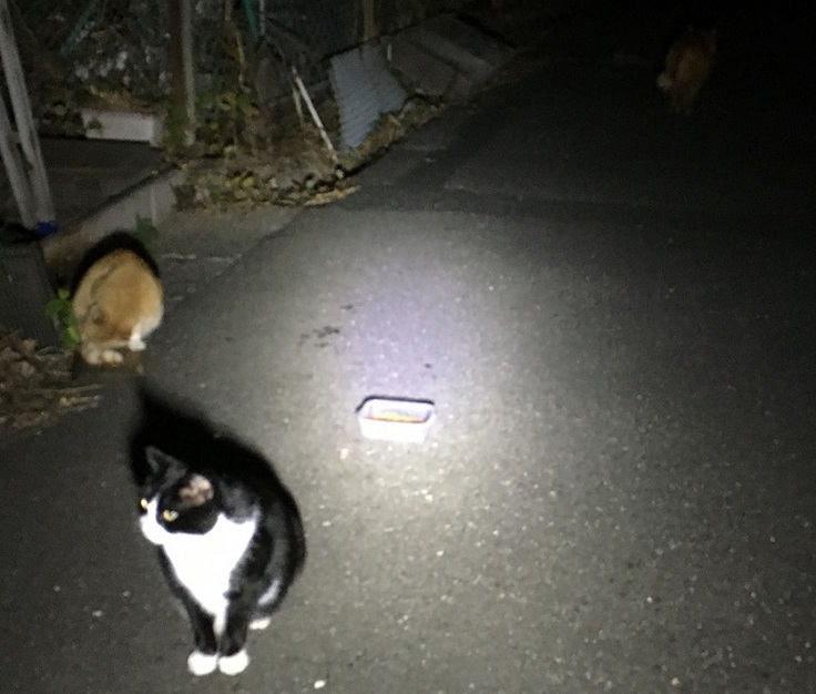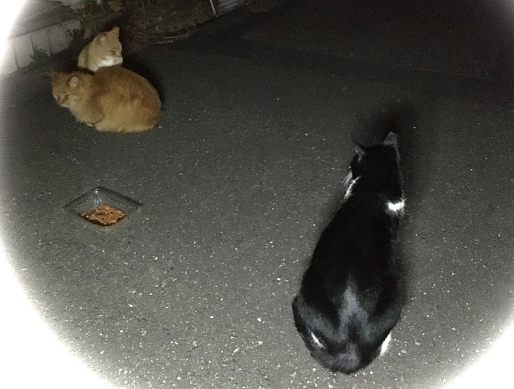 避難所に居ついてくれていたのに、新入り流児に追われて場所①に戻り、夜になってから皆猫と一緒にゴハンを食べに来ました。