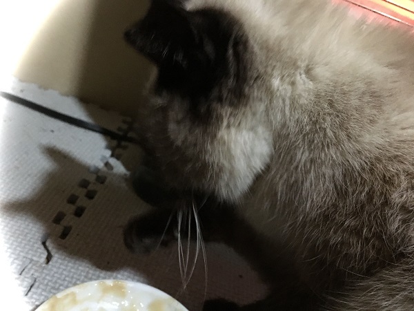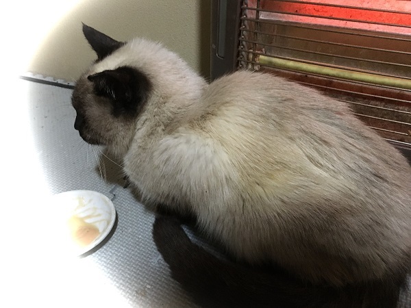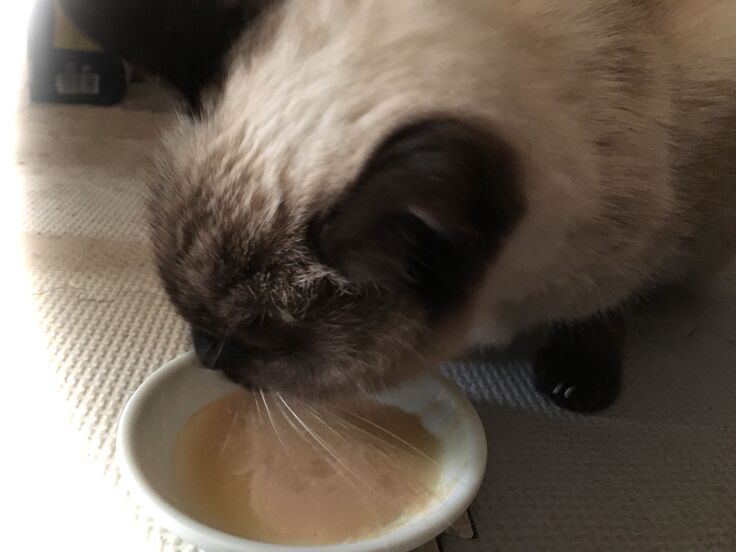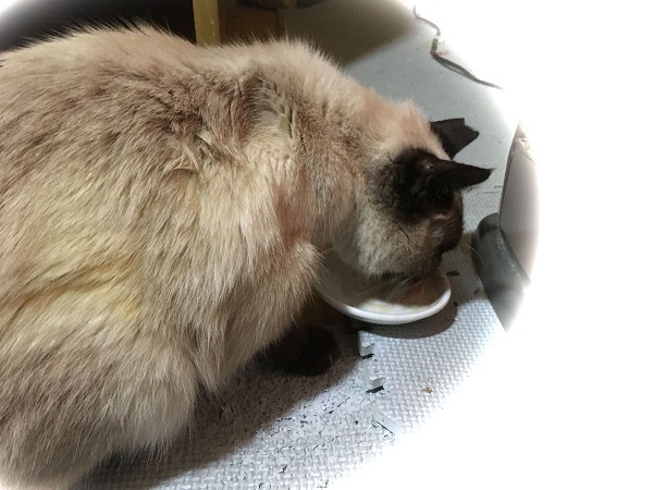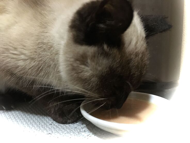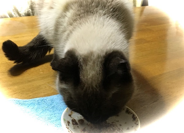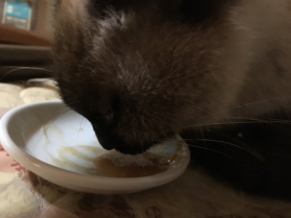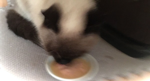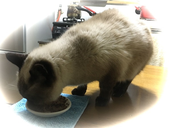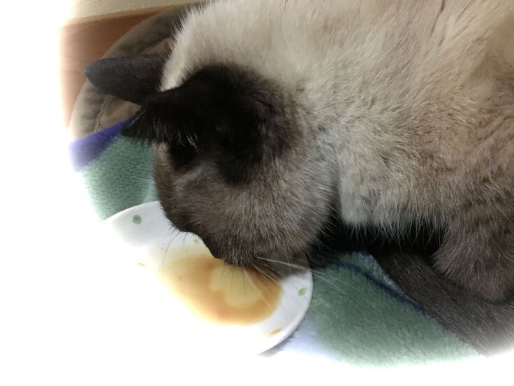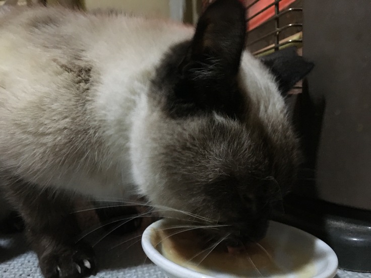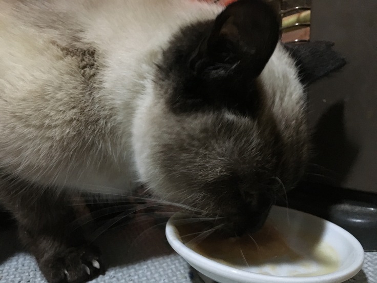 友達の猫は亡くなったそうなので、期待はするまいと思いつつ、試しに与えてみると、何も食べなかったシャムたんが、食べてくれました。