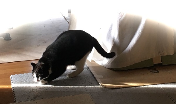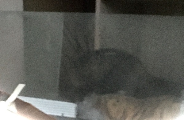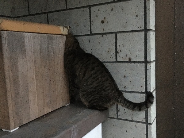 16:47 避難所へ。箱にひっつきべったりのそらくん。
