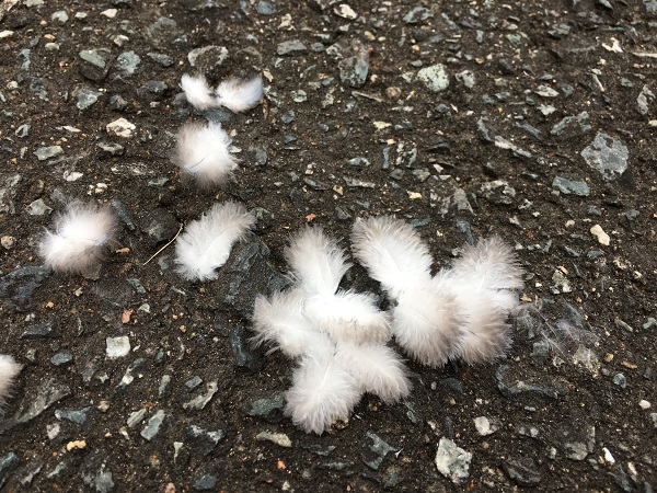 地面に散らばったおびただしい羽毛に、小鳥がカラスか猫の犠牲になったのだろうと探したが羽以外は見つからなかったことにまずは心が痛み。