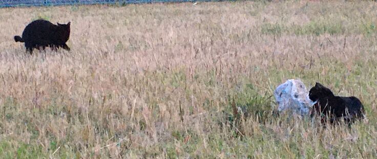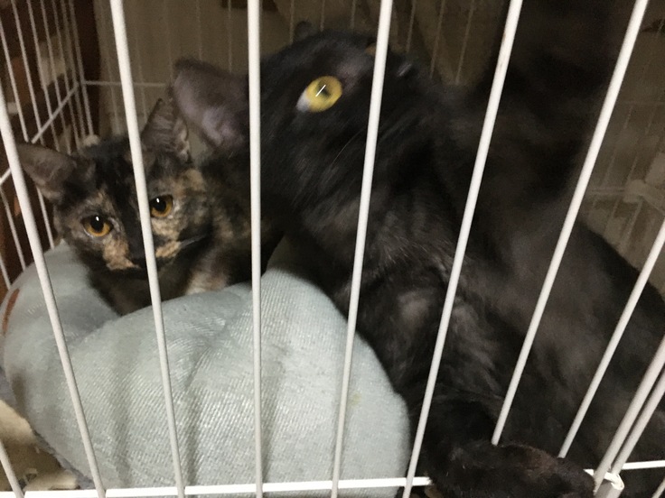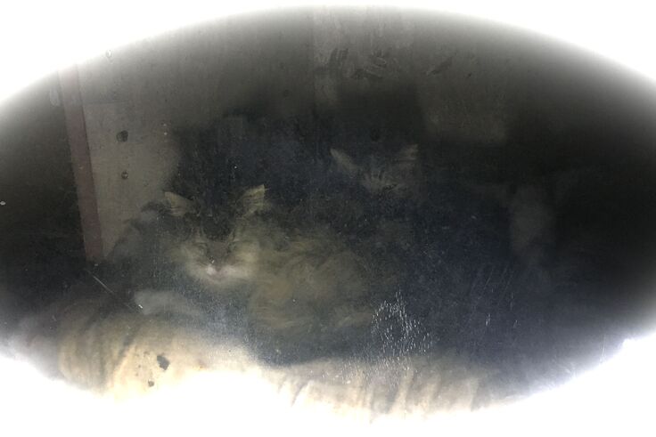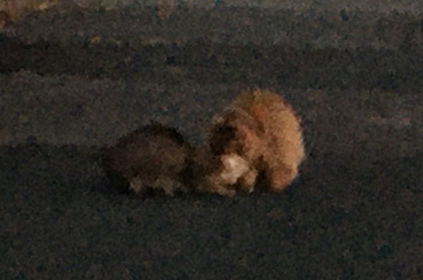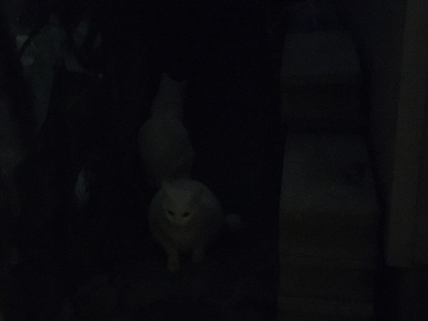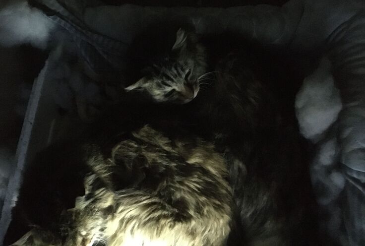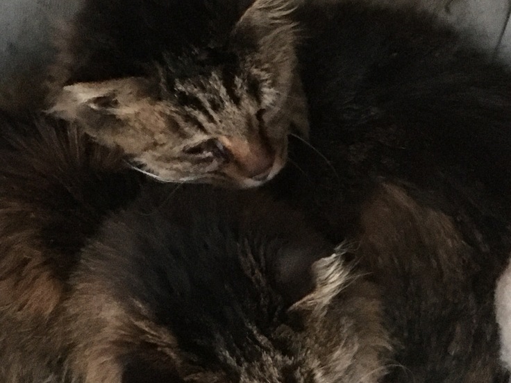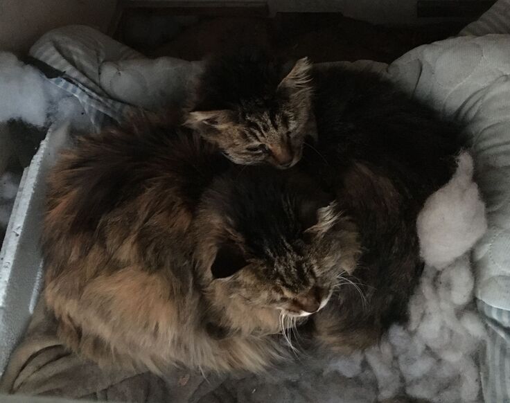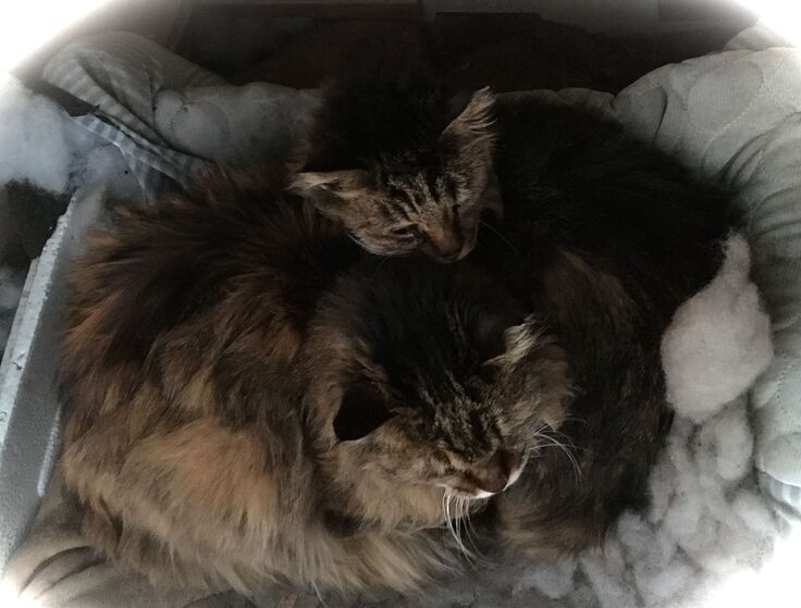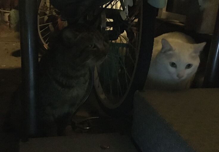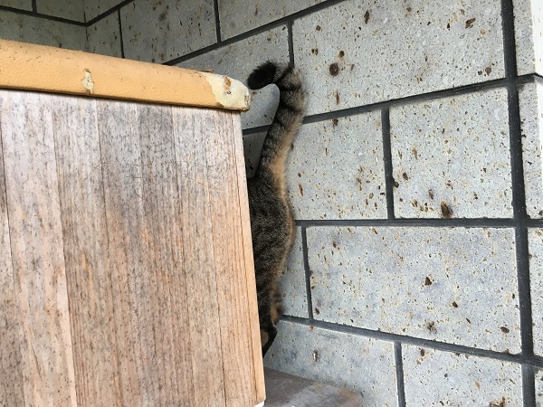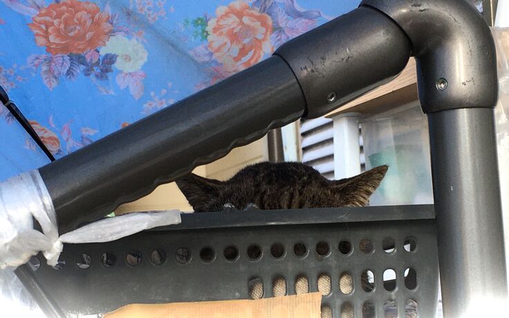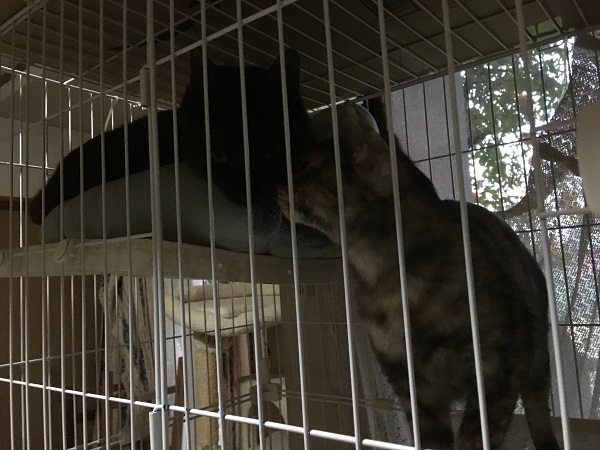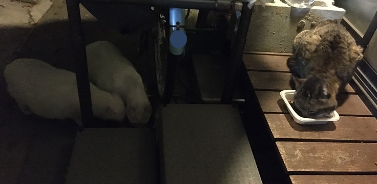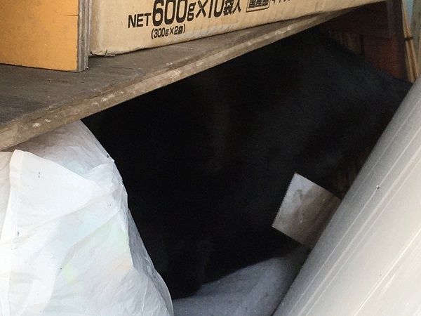 人の手の届かない場所で温めあう茶々モップとステルスモップ。