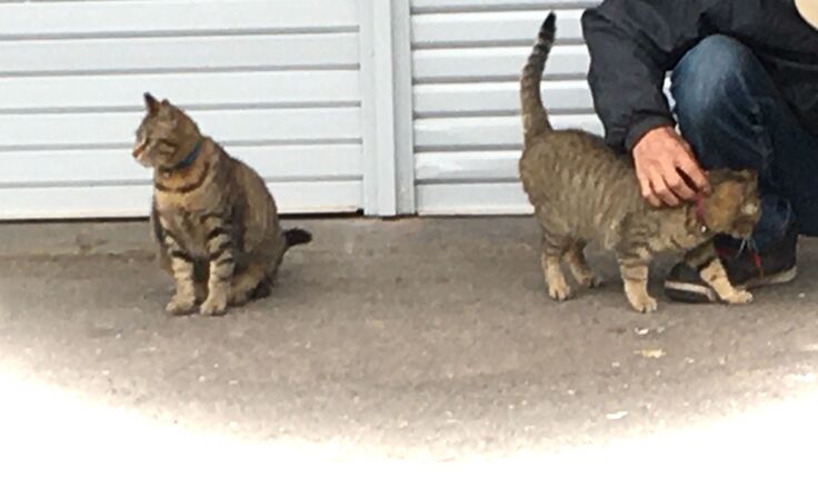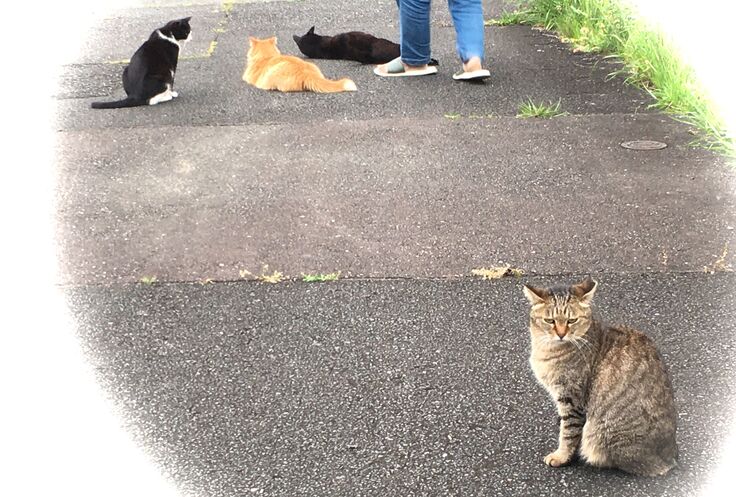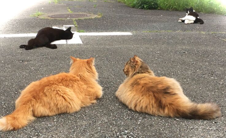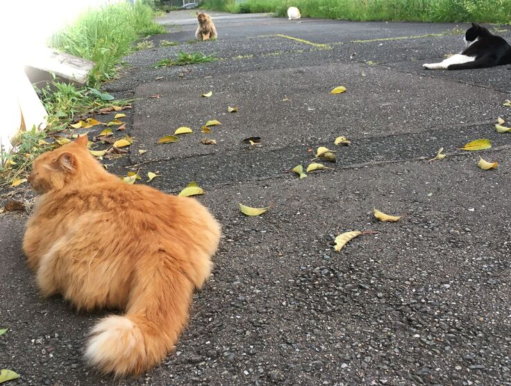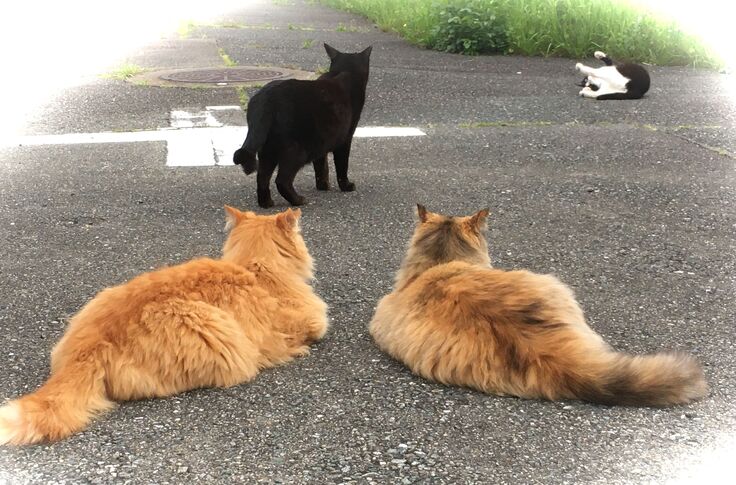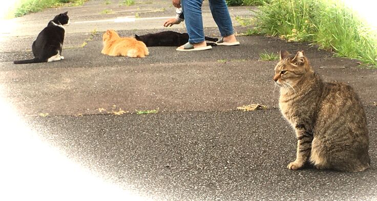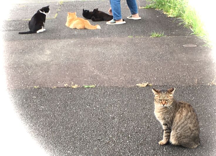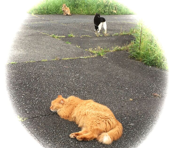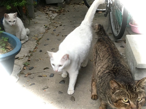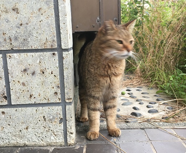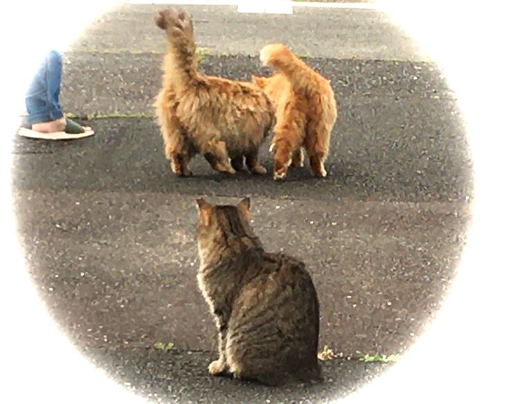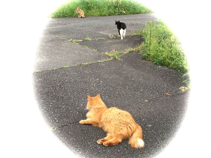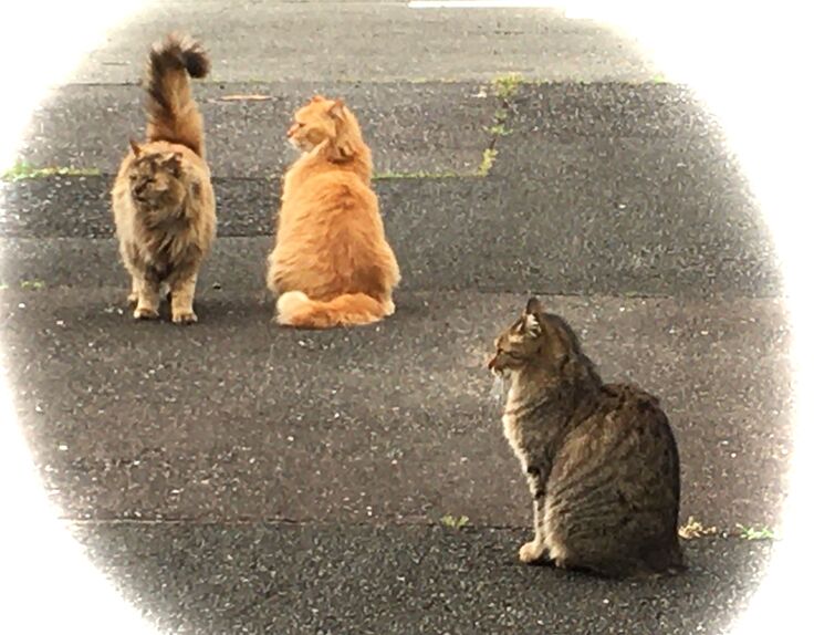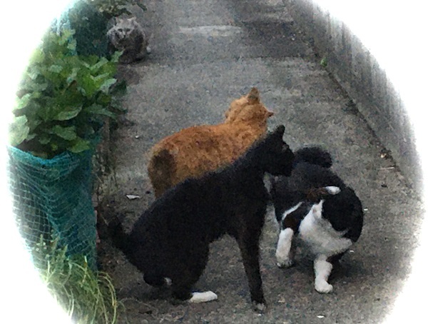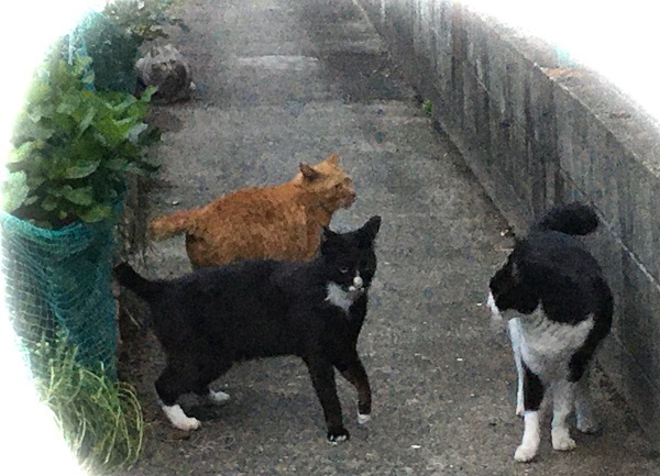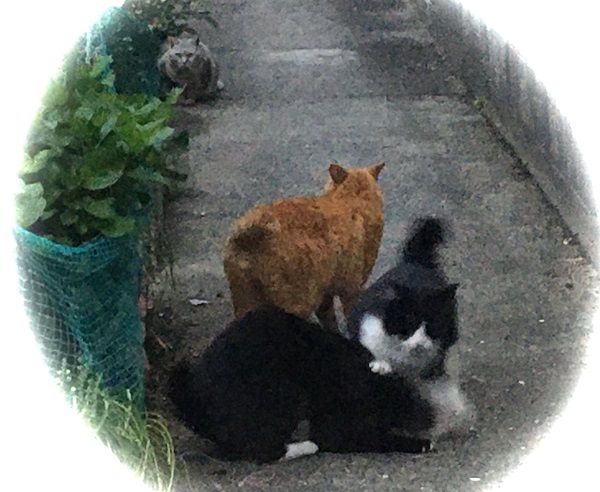 ジブリ邸前にて、カイトくん、大らかな茶トラ、器の小さい子、ぴやくん。
