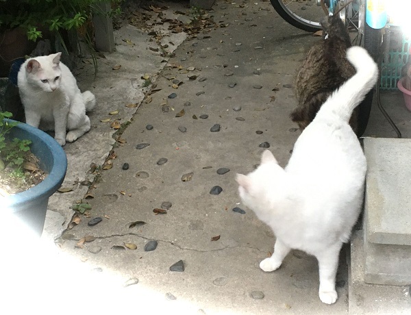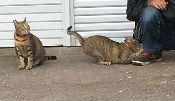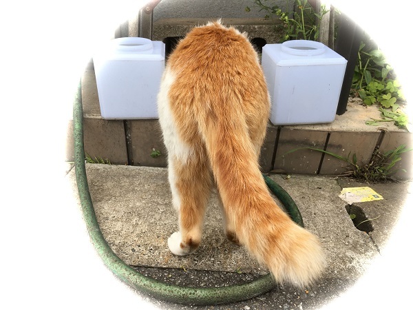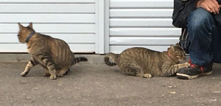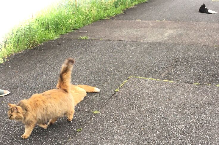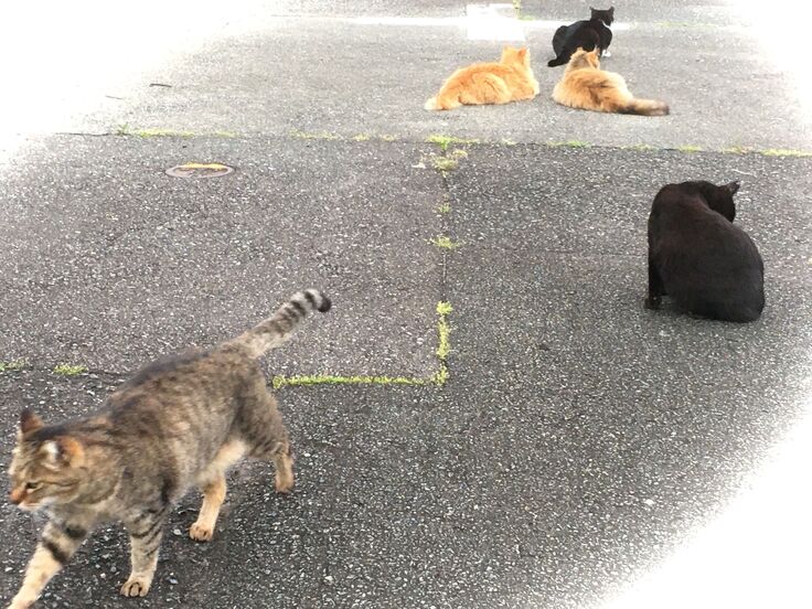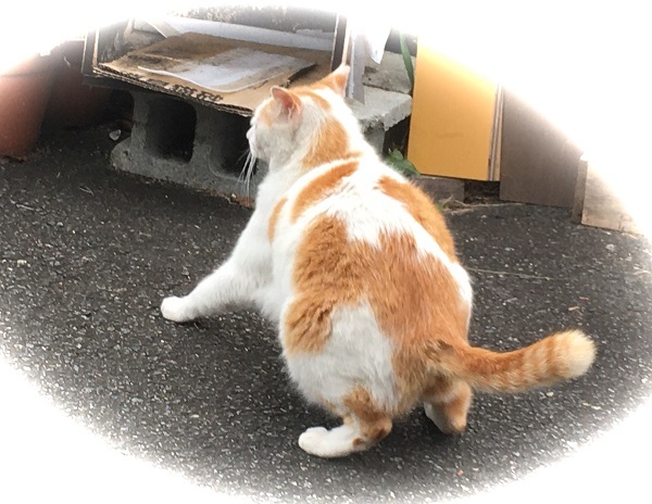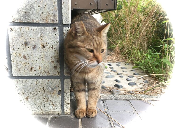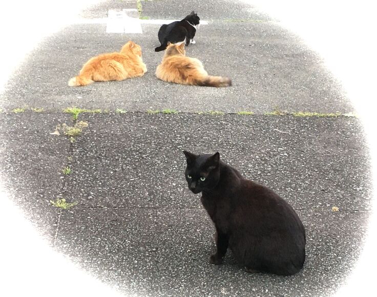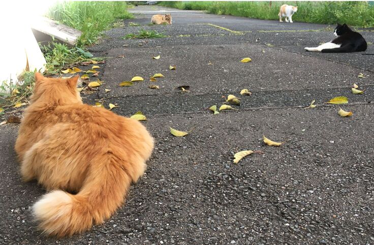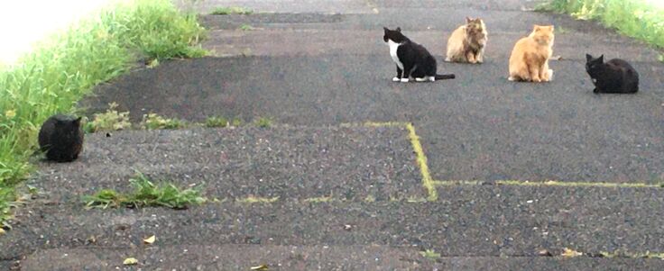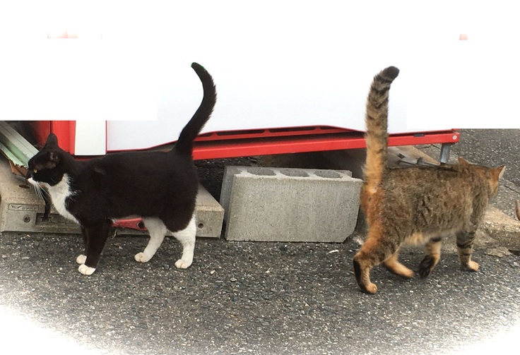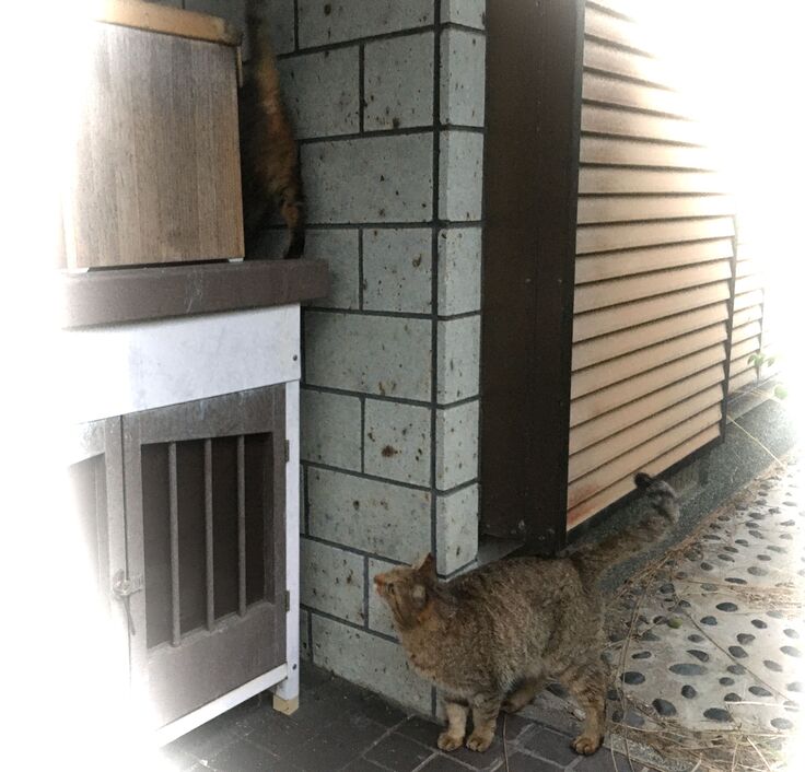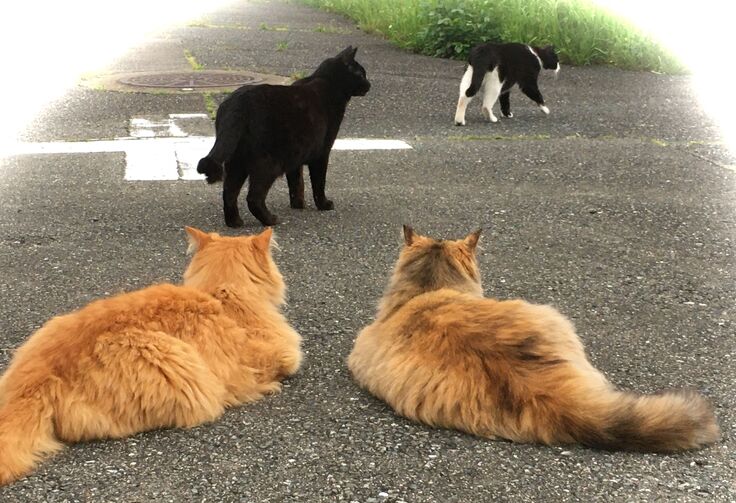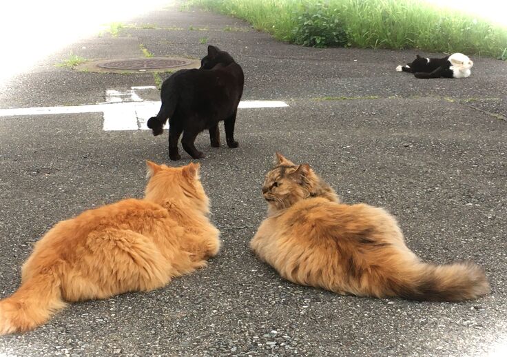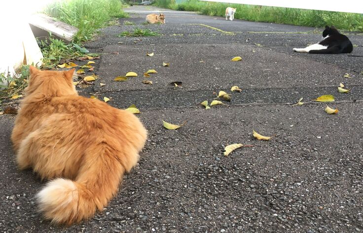 ジブリ邸前にて、カイトくん、大らかな茶トラ、器の小さい子、ぴやくん。