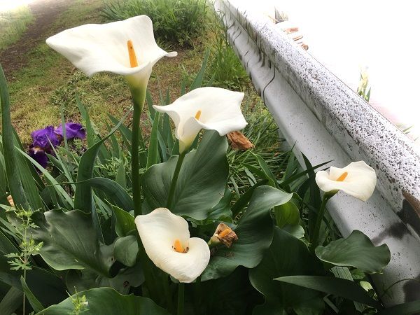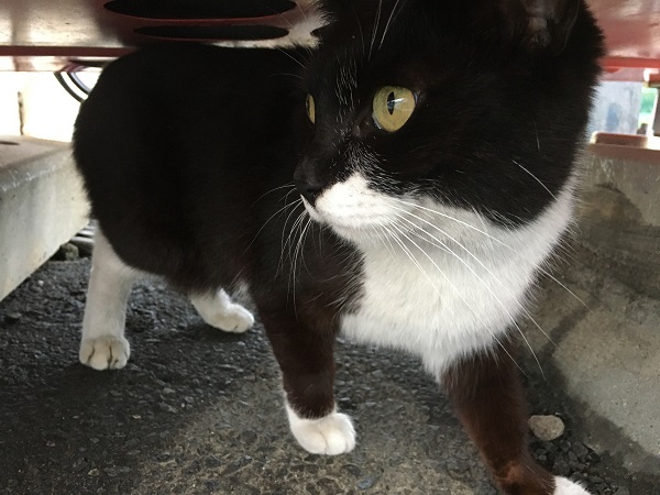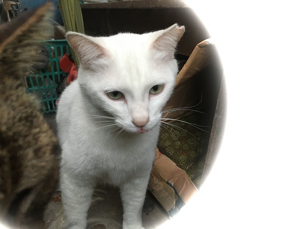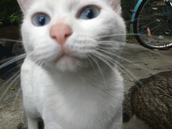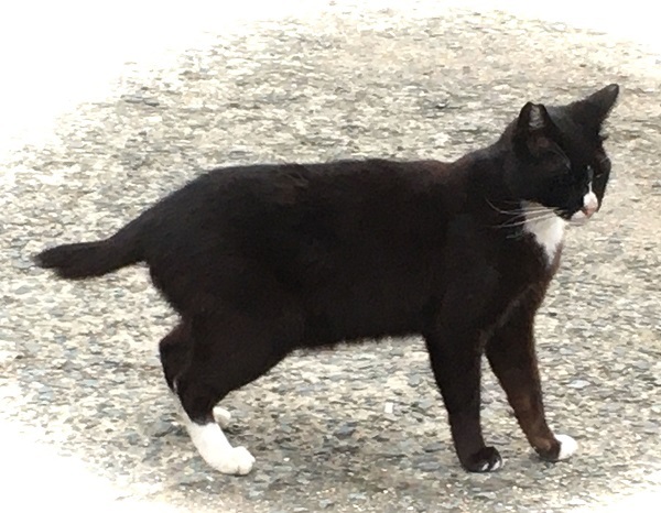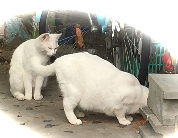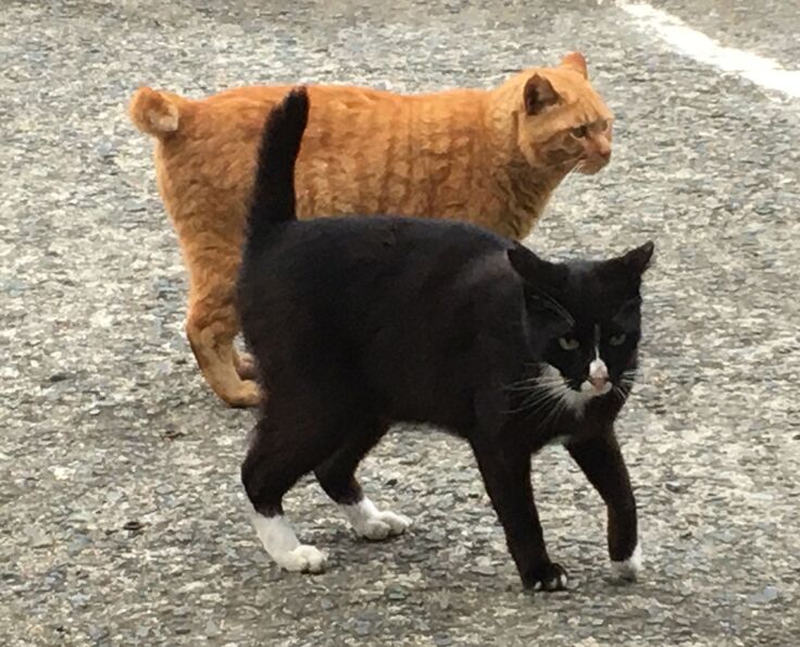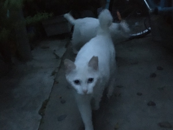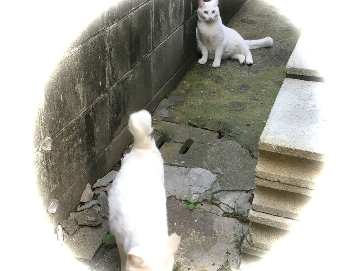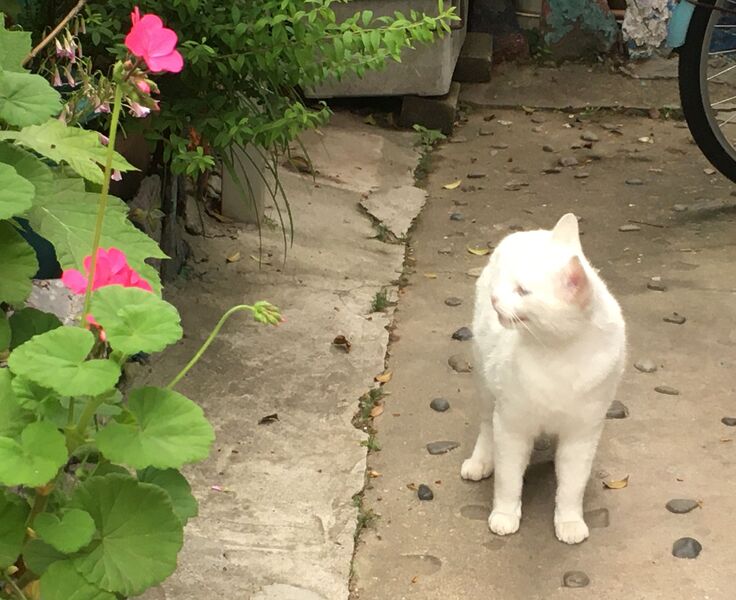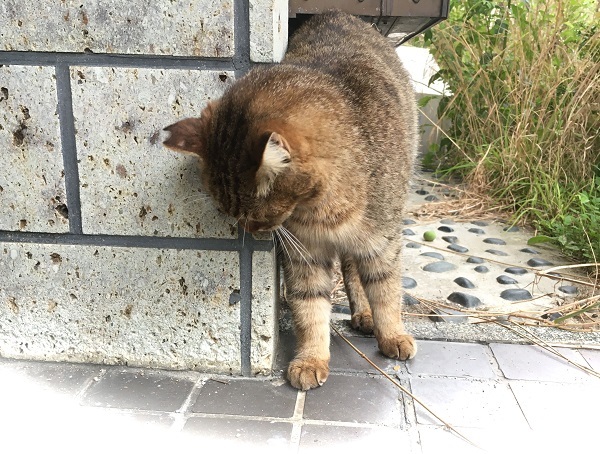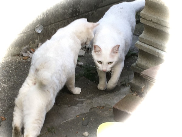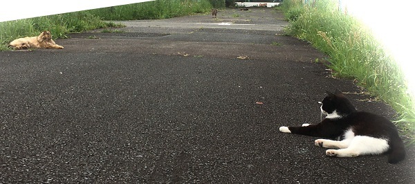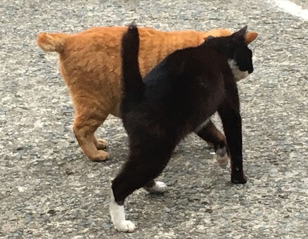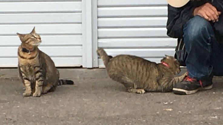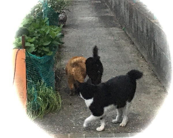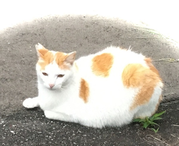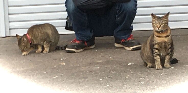 ジブリ邸前にて、カイトくん、大らかな茶トラ、器の小さい子、ぴやくん。